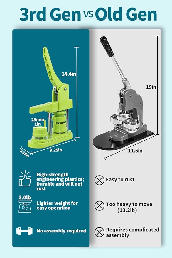 - 🎁New Upgrade-3rd Gen - DIY 25mm badge making machine adopt high strength engineering plastics, machine body and button-model is integrated, features light weight, long life span, easy operation, stainless. The upgraded swivel mount not only improves efficiency and accuracy but also helps with better positioning. Compared with the older generation of button press machines, the third generation of pin press machines has been optimized in all aspects, and the feel is more ergonomic.