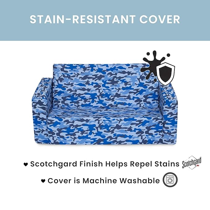 Delta Children Cozee 2-in-1 Extra Wide Convertible Sofa to Lounger-Comfy Flip Open Couch/Sleeper for Kids, Blue Camo