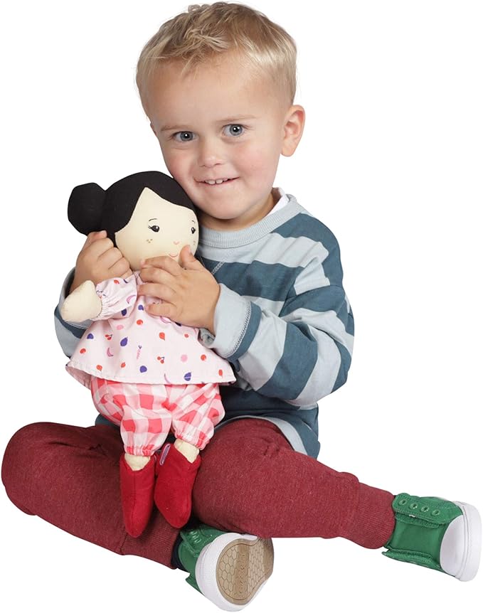 - 14 INCH SOFT DOLL: Playdate Friends Nico measures 14 inches from head to toe, with fully embroidered facial features and sculpted, fabric hair. Nico is wearing pink gingham style pants, a fruit-patterned shirt and shoes with hook-n-loop closures.