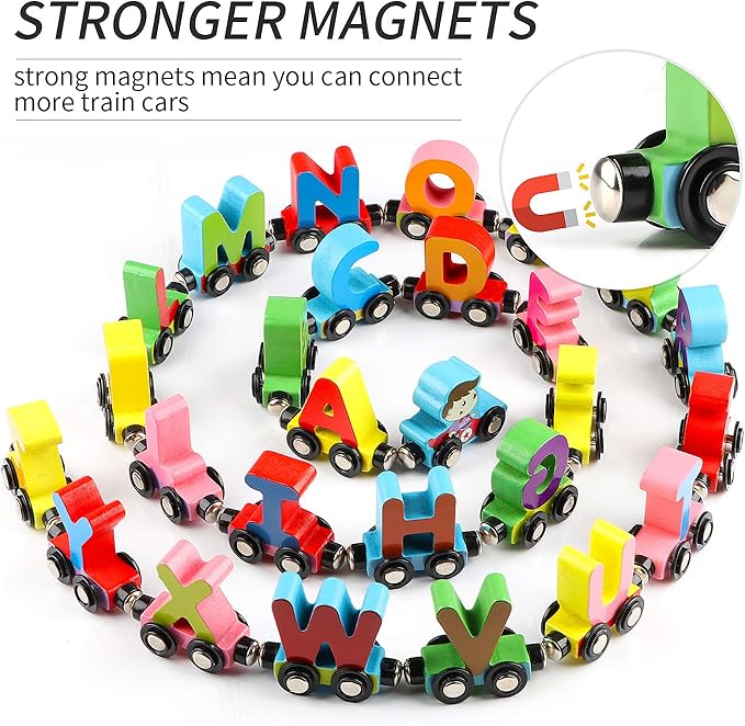 - Stronger Magnet: The magnets on our alphabet trains were carefully chosen and have been tested extensively to be stronger than those in other sets. This means more train cars can be connected together to make longer trains. 27 pcs wooden alphabet train compatible with other track toys.