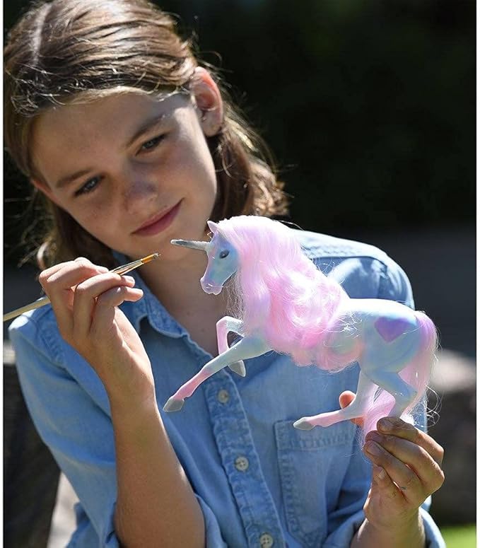 • INCLUDES: 1 Unicorn, 1 hairbrush, 1 paintbrush, 6 paint pots, and instruction sheet. Kit includes everything needed to paint a colorful unicorn. Unicorn measures 8"L x 6.5"H x 3"W