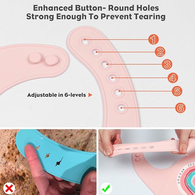 • 【Easy To Adjust】With 6 easy adjustable buttons, suitable for boys and girls aged from 4 month up to 3 years. The comfortable straps with the large neck radius will help your child's movement during eating. Roll up the flexible, memory-free bib for on-the-go dining; rescues clothes from endless spills and stains.