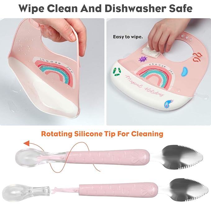 • 【Baby Food Feeder Set】Includes baby food spoon and bib. Travel Case is convenient to carry the baby spoon going out , ensures that no matter wherever, your baby utensils will stay incredibly clean. Baby silicone bib rolls up neatly for storage and travel, temperature resistance up to 180℃, can be in boiled water or steam.