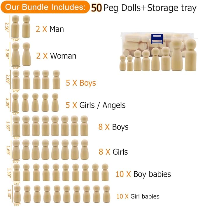 - Family Peg Doll with Gift Storage Case: Set of 50 Unfinished Wooden Peg Dolls Kit includes storage box to keep them organized and also makes an ideal gift; Dimensions: 2 Man x 2.56 in, 2 Woman x 2.56 in, 5 Boys x 2.08 in, 5 Girls/Angels x 2.08 in, 8 Boys x 1.69 in, 8 Girls x 1.69 in, 10 Boy babies x 1.37 in, 10 Girl babies x 1.37 in. Large and Small.
