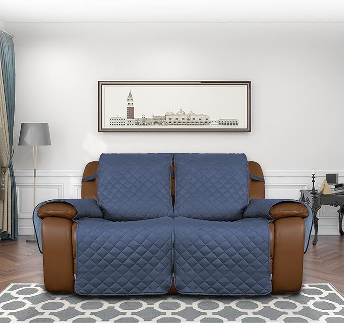 Easy-Going Recliner Sofa Cover, Reversible Couch Cover for Double Recliner, Split Sofa Cover for Each Seat, Furniture Protector with Elastic Strap for Kids, Dogs, Pets(2 Seater, Dark Blue/Light Blue)