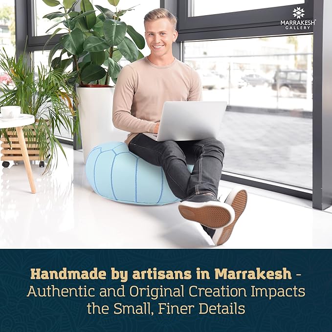 - Handcrafted by Artisans in Marrakesh - Made from 100% genuine soft leather, this Round Leather Cover pouf ottoman features exquisitely detailed, hand-stitched embroidery with a unique design down to the finest details