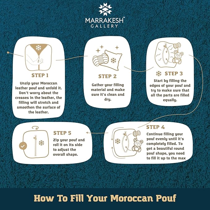 - Stuff in Seconds - With a zippered back , our Moroccan pouf is super quick and easy to stuff, supporting up to 10-12lbs. of filling. Use anything around the house - polyester fiber, towels or sheets, or plastic grocery bags. Old clothing may be best, to make the leather pouf extra cushiony and comfy