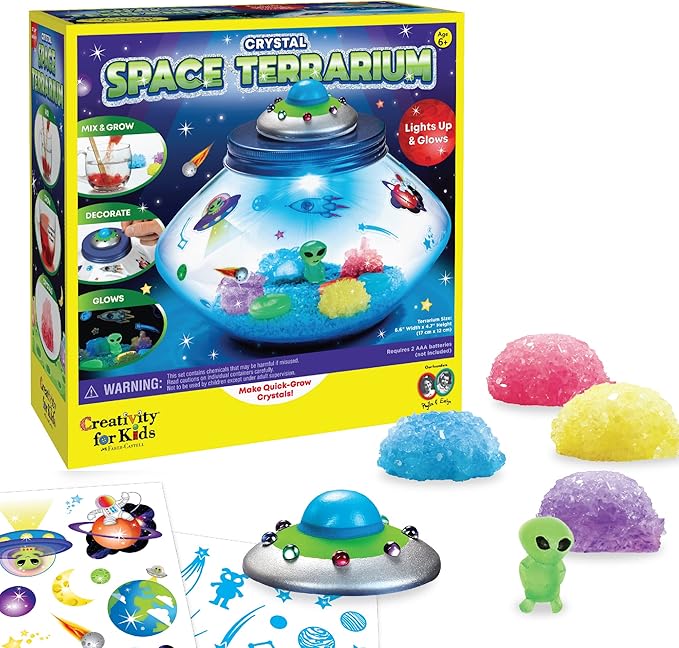 - SCIENCE TOYS - Blast off and explore the cosmos with a play and pretend STEM science kit for kids! Learn about the wonders of science and chemical reactions by growing your own crystals and use them to decorate and build your own UFO shaped terrarium