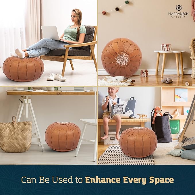 - Handcrafted by Artisans in Marrakesh - Made from 100% genuine soft leather, this Round Leather Cover pouf ottoman features exquisitely detailed, hand-stitched embroidery with a unique design down to the finest details