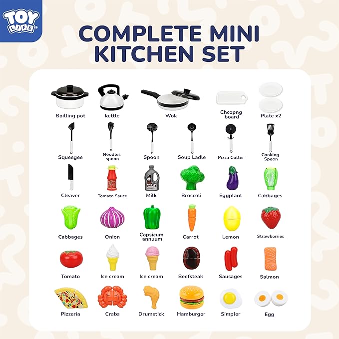 - 🥘 Complete Kids Kitchen Accessories Set - Various of cooking toys include play kitchen pots and pans kettle and different cookware utensils. In this upgraded kitchen set for kids, we also added some seasoning like ketchup, tomato sauce, and chocolate milk sauce to add more fun for cooking pretend play. Moreover, these kitchen toys also come with play kitchen food with different vegetables, fruits, fast foods, seafood, and dessert!!!