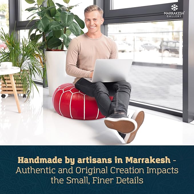 - Handcrafted by Artisans in Marrakesh - Made from 100% genuine soft leather, this Round Leather Cover pouf ottoman features exquisitely detailed, hand-stitched embroidery with a unique design down to the finest details