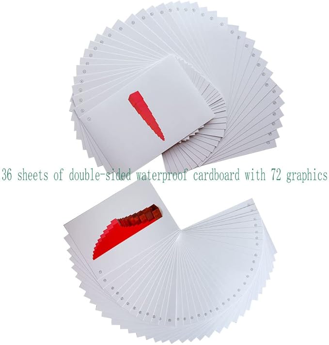 - PRODUCT COMPOSITION:36 task cards, 72 sides, one wooden box. Including Pink Tower, Brown Stair, Long Red Rods single connection and combined operation tasks