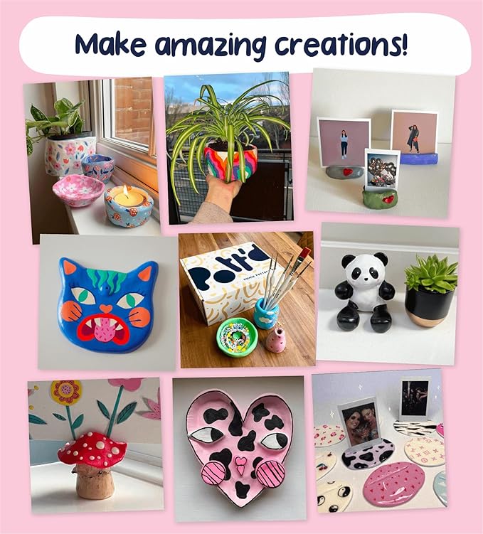 - 🍠Paint - Your kit comes with a set of 8 premium acrylic paints, tested to ensure perfect colour and coverage on our air-dry clay. Plus 2x brushes, one large for coverage and one fine for detailing. We also include a pot of white base coat, PLUS a special gloss varnish to give your creation that professional shine and protect it from the elements!