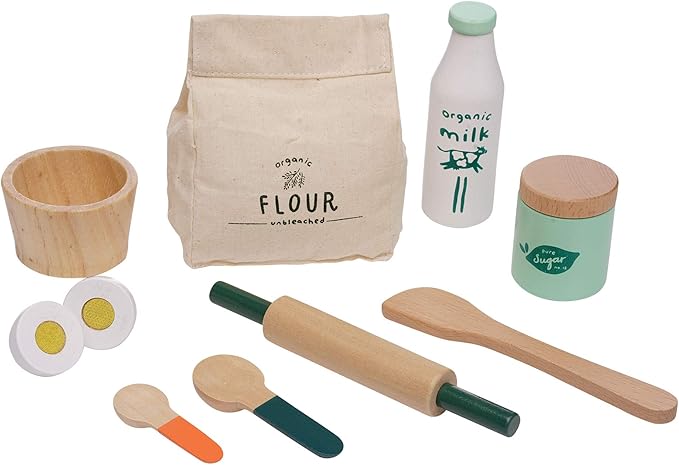 - ADDITIONAL ITEMS IN PLAY COOKING TOY SET: Also has an organic bottle of milk, pretend bag of organic flour and one egg - two halves that can be pulled apart and reattached.