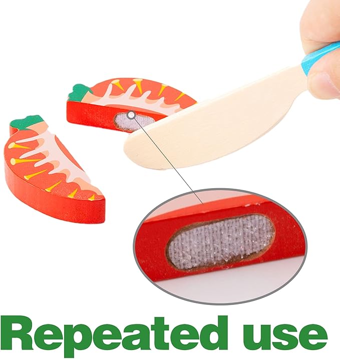 - 【Great Design for Toddler】: Contains 4 kinds of objects and a wooden paring knife. Mom can teach the baby to recognize various items. The baby can use the wooden paring knife to cut them in half one by one, and put them into the puzzle.