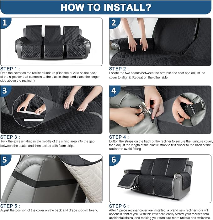 - 【REDUCE SLIP-OFF CONCEPT】Reduce slide around! 1.Solid round colloid design on the back of our recliner cover; 2.Additional flexible elastic straps and foam strips, 3.Two elastic straps on the bottom of the seat cover and matching buckles (only two)