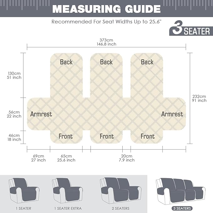 - 【DIMENSIONS GUIDE】 New colors and styles will make your furniture more unique and welcoming. 3 seater recliner cover fit a sofa with a seat width of 76.8 in, see measurement guide in photos. NOTE: Please confirm the size before purchasing