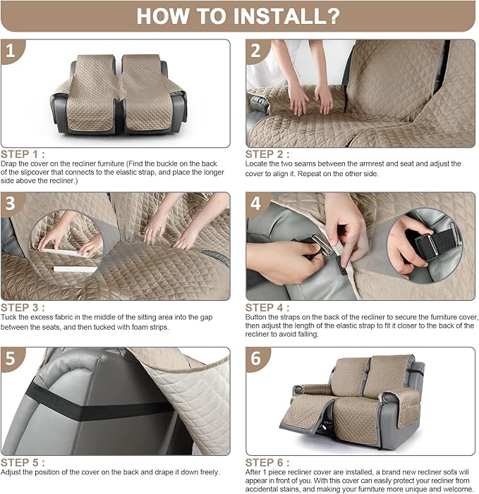 - 【REDUCE SLIP-OFF CONCEPT】 1.Solid round colloid design on the back of our recliner cover; 2.Additional flexible elastic straps and foam strips, 3.Two elastic straps on the bottom of the seat cover and matching buckles (only two)