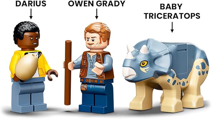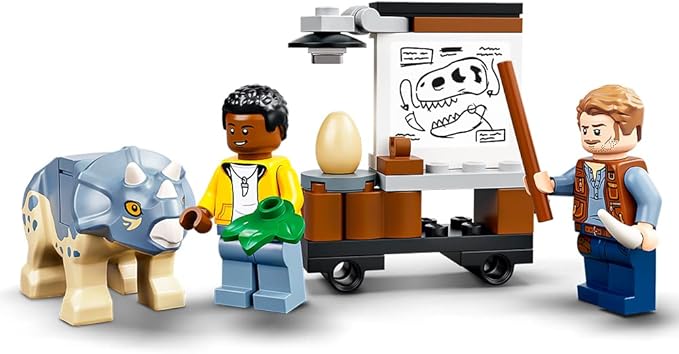 - Includes Darius and Owen Grady minifigures, a baby Triceratops toy figure, a buildable drawing board, plus accessory elements including a pointer stick, dinosaur egg, teeth fossil and a leaf