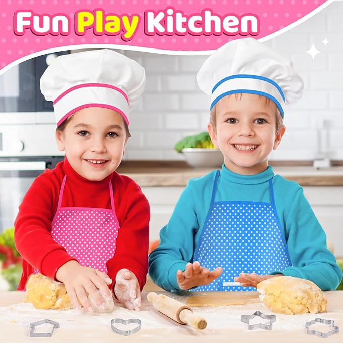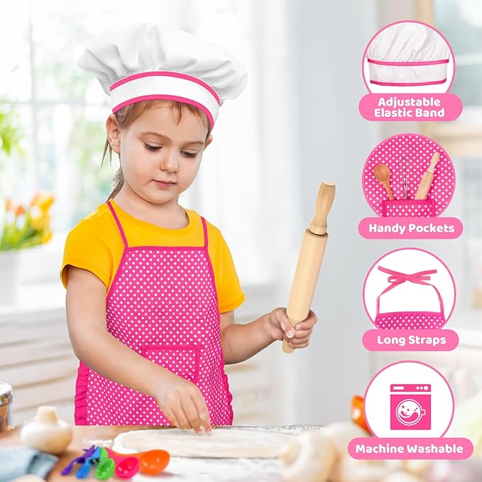 - FOR DIFFERENT AGED BOYS GIRLS: The chef's hat is elastic designed, and kids apron has long enough ropes to be tied around the neck and waist respectively, Applicable for most body type. Optional colors, kids cooking sets suitable for 3-12 years old boys girls