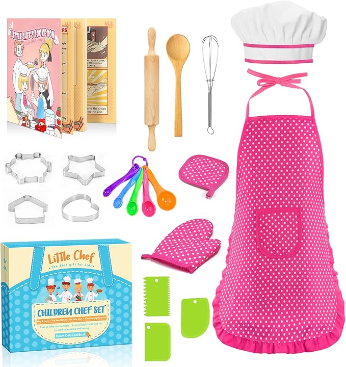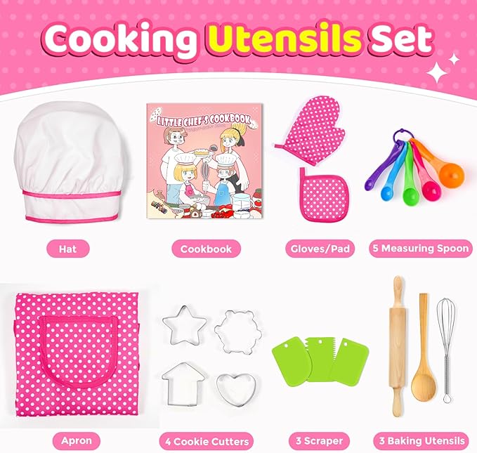 - COMPLETE 20PCS/SET: Includes Apron, Chef's hat, Cookbook, Oven glove, Insulation pad, Wooden spoon, Whisk, Rolling pin, 5 measuring spoon, 3 scrapers and 4 cookie cutters. With CPC certificate, passed CPSIA and ASTM standard tests, Completely meet kids' basic cooking and baking game needs