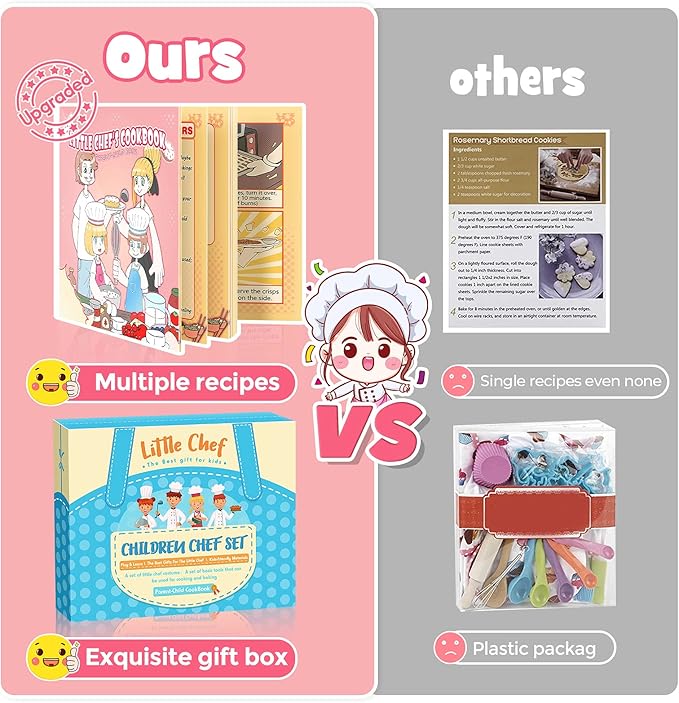 - COMES WITH COOKBOOK: Kids don’t know how to make food? Do not worry! kids baking set has a well-designed and bound cookbook, which introduces 10 kinds of food preparation methods through the most simple way of easy understanding pictures and texts. Correctly help children get started with cooking