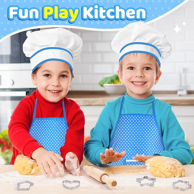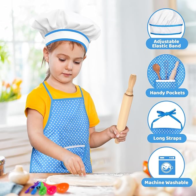 - FOR DIFFERENT AGED BOYS GIRLS: The chef's hat is elastic designed, and kids apron has long enough ropes to be tied around the neck and waist respectively, Applicable for most body type. Optional colors, kids cooking sets suitable for 3-12 years old boys girls