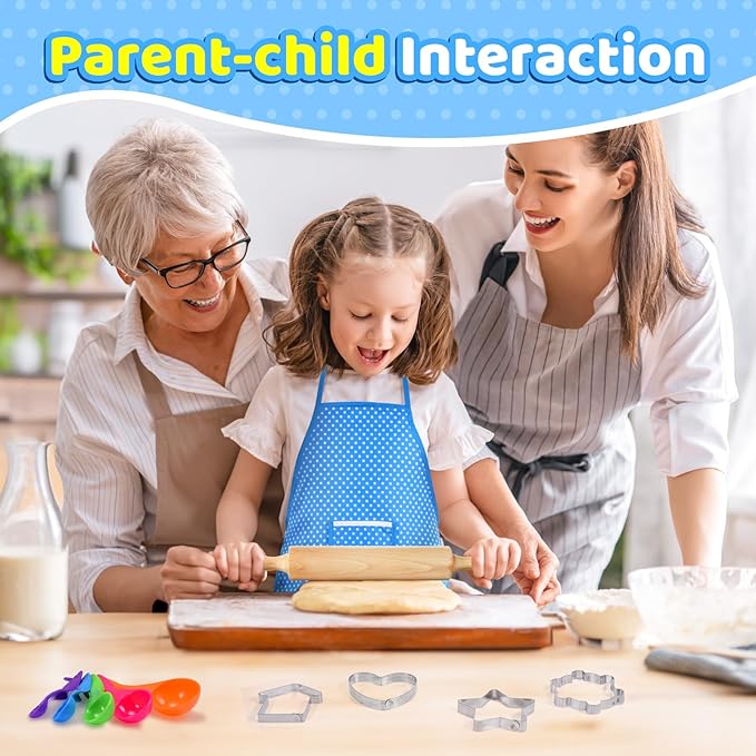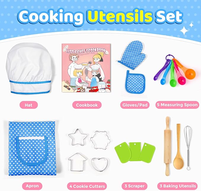 - COMPLETE 20PCS/SET: Includes Apron, Chef's hat, Cookbook, Oven glove, Insulation pad, Wooden spoon, Whisk, Rolling pin, 5 measuring spoon, 3 scrapers and 4 cookie cutters. With CPC certificate, passed CPSIA and ASTM standard tests, meet kids' basic cooking and baking game needs