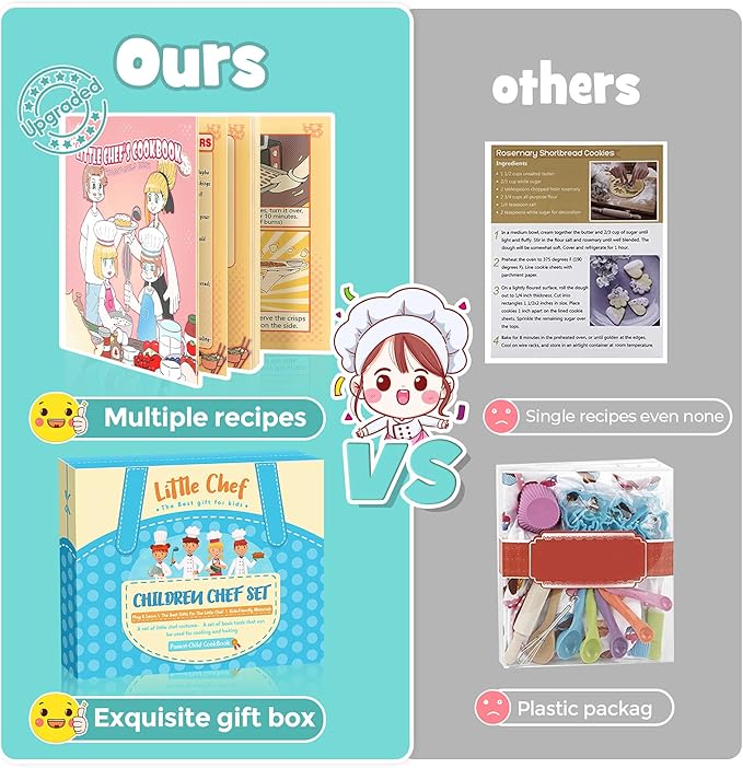 - COMES WITH COOKBOOK: Kids don’t know how to make food? Do not worry! kids baking set has a well-designed and bound cookbook, which introduces 10 kinds of food preparation methods through the most simple way of easy understanding pictures and texts. Correctly help children get started with cooking