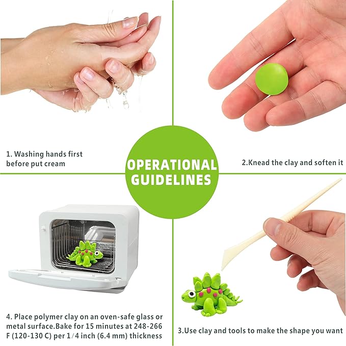 - Bake method: use the oven to preheat the temperature to 248-266℉, the baking process is completed by an adult (recommended), small workpieces can be heated by a hair dryer (less than 1-2 inches), please refer to the instructions for all usage methods