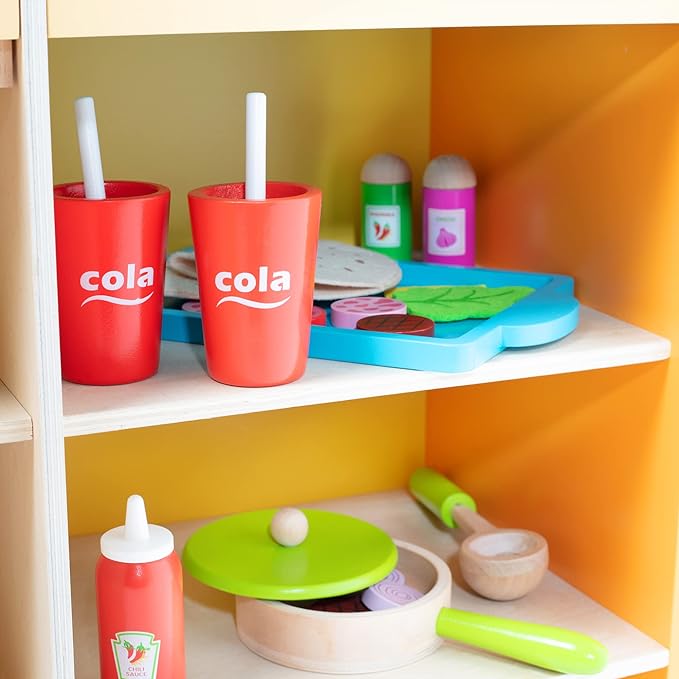 - 30+ Play Pieces - Contents Include: 2 taco shells, onions, cheese slices, lettuce, wooden pepper strips, kebabs, food tray, tomatoes, meat patties, condiment shakers, bottle of chili sauce, spatula, scooper, pot and pan
