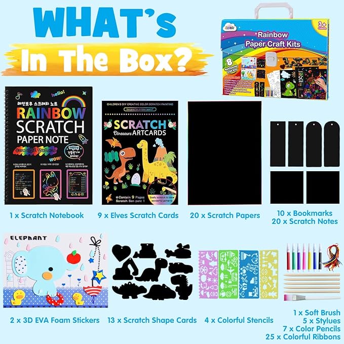 - Complete art craft kit includes scratch papers, foam stickers, color pencils, brush, ribbons, and more - 117 pieces total