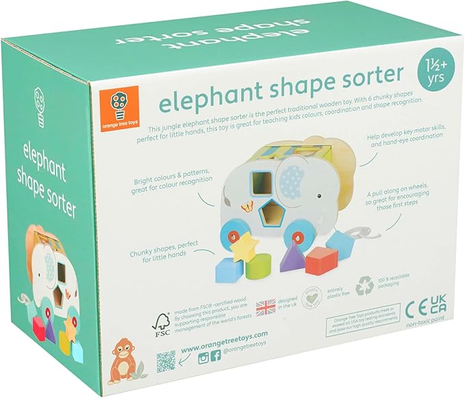 Orange Tree Toys: Shape Sorter: Jungle Elephant - Wooden Wheeled Animal Sorter, 6 Shape Blocks, Push-Pull-Sort, Educational Toy, Toddler & Kids Age 1+