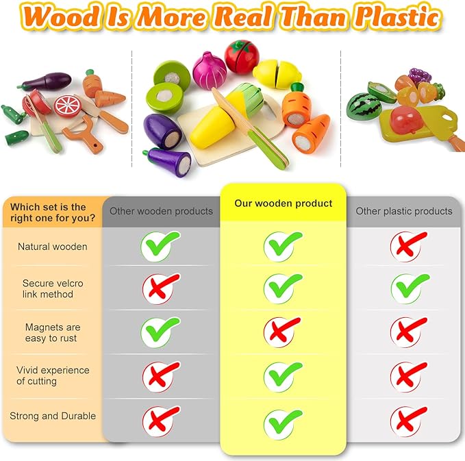 - Perfect Gift For Kids: Exquisite wooden toys are very suitable for kitchen set for kids for toddlers 3 years old. the wooden food is spread out and glued together with nylon buckles, making a "crunchy" sound when the children cut the food toys, toddler kitchen playset which can bring the children a realistic feeling, toddler cooking set is the best gift for preschoolers and toddlers for birthdays, if you are not satisfied, please contact us.