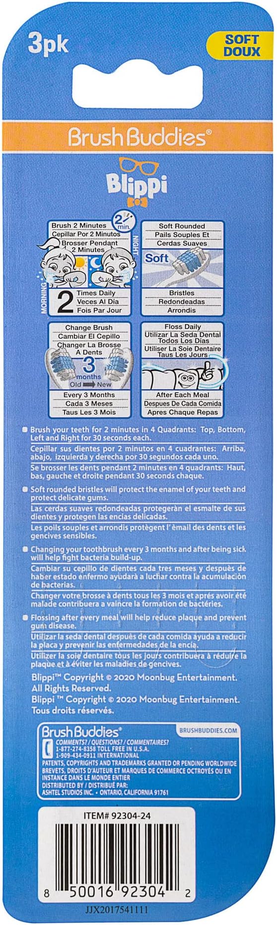- [What's Included] The Brush Buddies Blippi Manual Toothbrush Pack includes 3 multi-colored Blippi kid's toothbrushes.