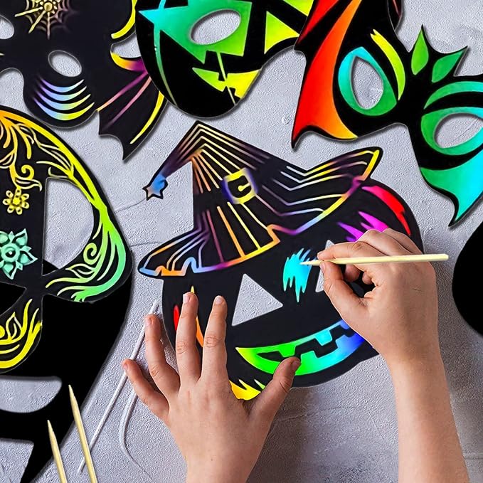 - 【Easy-To-Draw Materials】: These Halloween scrapers are made of thickened cardboard with a black coating on the surface, which is safe and durable, the scratch pen is made of bamboo, and band is made of elastic band. Just choose the shape you like, then hold the stick and gently scrape out the patterns, then use the elastic band to wear the mask you want