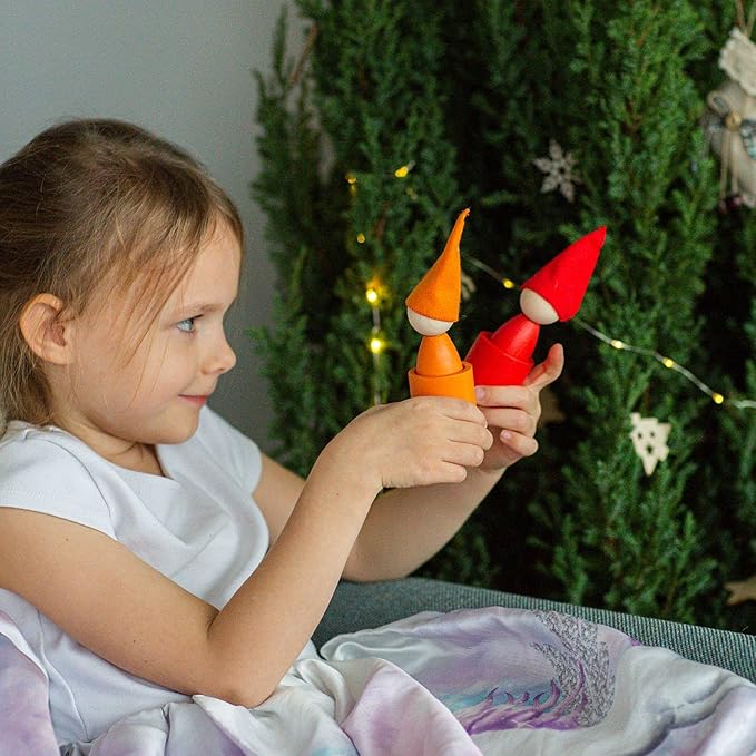 Ulanik Large Peg Dolls in Cups with Hats Toddler Montessori Toys for 3 Year Old + Wooden Waldorf Dolls for Learning Color Sorting and Counting — 12 Gnomes