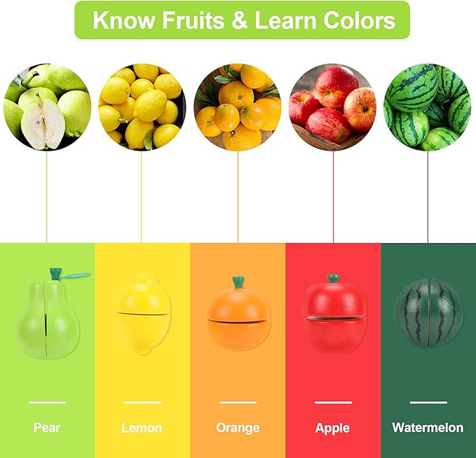- 【Colorful & Realistic】: This play kitchen food not only includes 6 different fruits with a bright and colorful appearance that helps with color perception but also uses a velcro design that makes the fruit toys easy to "cut" with a satisfying crunch sound, all of which ensured the wooden fruit cutting set for kids popularity among kids.