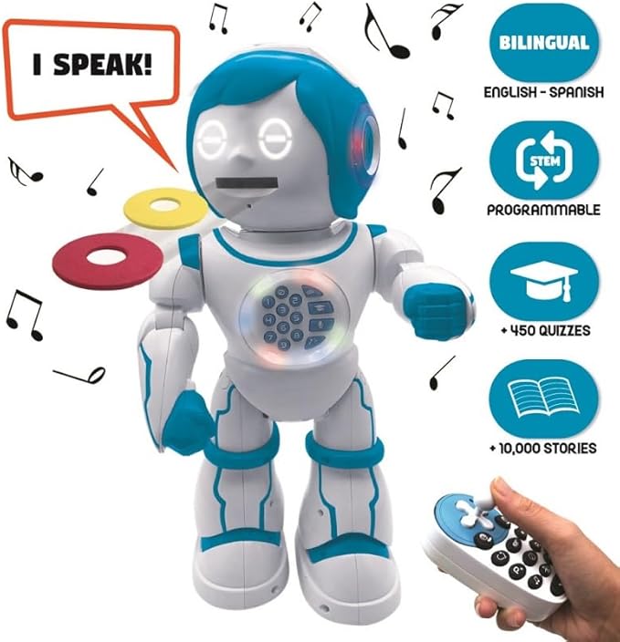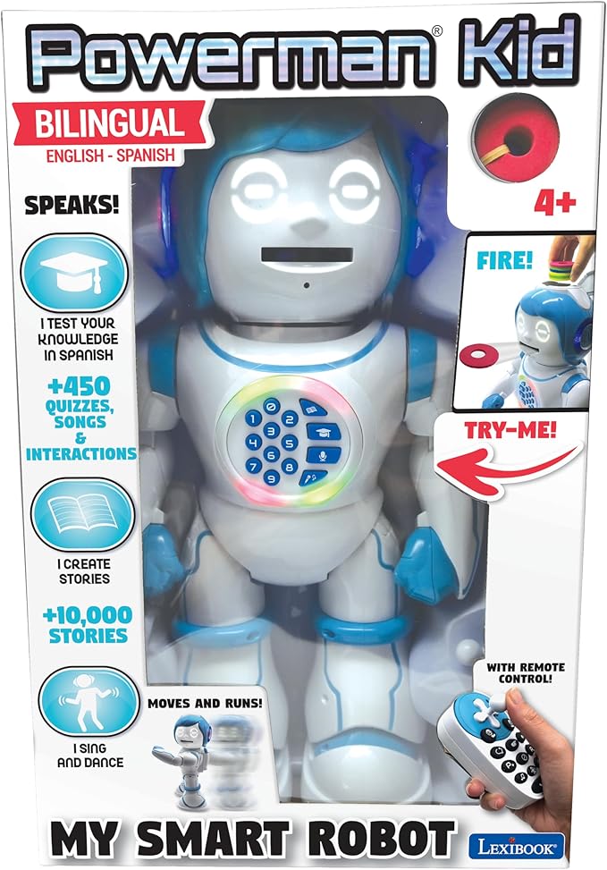 Lexibook Powerman Kid - Educational and Bilingual English/Spanish Robot - Walking Talking Dancing Singing Toy - STEM Programmable Telling Creating Stories - Quizzes Shooting Discs for Kids - ROB90US