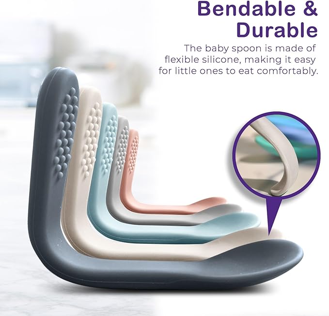 • Silicone Baby Spoons First Stage Pack of 5 - As your baby is transitioning to solids, these silicone spoons baby will aid in developing their skill of self-feeding and at the same time sharpening their motor skills, the silicone baby spoon is designed with those tiny hands in mind, so it should be easy to grasp and soft to touch. Choose these Silicone Baby Spoons self feeding 6 months to empower your baby's developmental milestones with confidence and comfort.