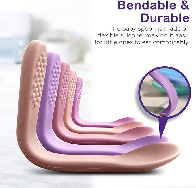 - Silicone Baby Spoons First Stage Pack of 5 - As your baby is transitioning to solids, these silicone spoons baby will aid in developing their skill of self-feeding and at the same time sharpening their motor skills, the silicone baby spoon is designed with those tiny hands in mind, so it should be easy to grasp and soft to touch. Choose these Silicone Baby Spoons self feeding 6 months to empower your baby's developmental milestones with confidence and comfort.