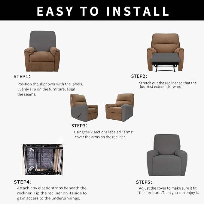 - THE RECLINER COVER THAT STAYS IN PLACE: Featuring non skid elastic. Because 4 pieces design, they fit better, recliner cover can cover the back of your recliner, providing all-round protection. You don’t need to adjust after sitting.