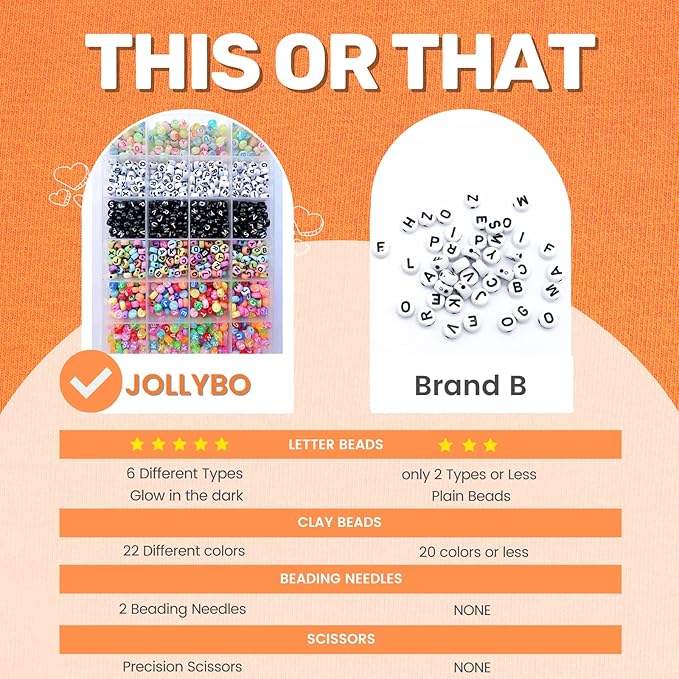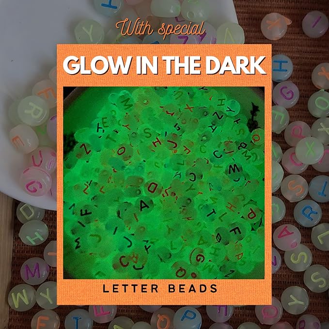 - 10,500PCS EVERYTHING YOU NEED INCLUDED - 8,800 flat clay beads sets, Heishi beads in 22 colors, 6 fun and colorful letter jewelry beads with glow in the dark (200 pcs each), 5 necklace spacers (golden beads, clamps, rings, etc.), 2 rolls of elastic string, 2 beading needles, and scissors with safety pouch for braclet kit beads and necklace jewelry making kits. Great bracelet beads for jewelry making beads crafts!