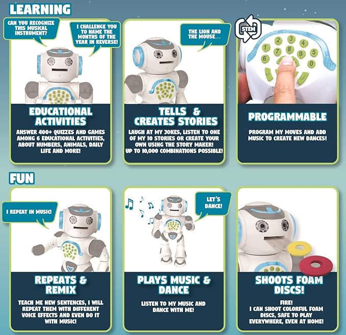- PROGRAMMABLE - A real STEM robot that helps kids discover the logic of programming. Program up to 40 actions. Add music to create and save your choreographies!