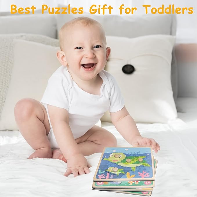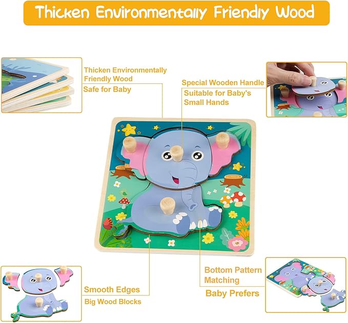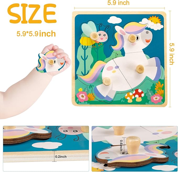 • Durable and with Handle - Our wooden puzzles are made of thickened wood, so it is hard and not easy to deform or crack, very durable, and your baby can enjoy it for a long time. The size of each puzzle is 5.9 x 5.9 x 0.2 inches, and each wooden block has a handle, which is more convenient for the baby's small hands to hold