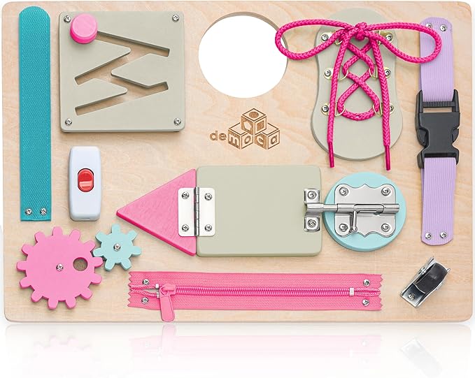 • Activity board for toddlers - deMoca Wooden Toy is a Montessori toddler toy with colorful wooden pieces. This basic skills activity board features a zipper, buckles, and a shoe-tying kit that lets kids practice, fostering independent dressing skills and coordination.