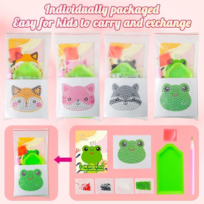 - Valuable Set. Our Valentine's gift set includes 24 valentine's day cards and 24 DIY diamond painting sticker kit in indiviually package. Each greeting card is well designed with an cute animal pattern and valentine's punchline. The instruction of diamond painting kit is printed on the back of each card. Sign on the "To" and "From",put the card into the bag of diamond painting kit,make it a perfect valentine's day card for classroom gift exchange.