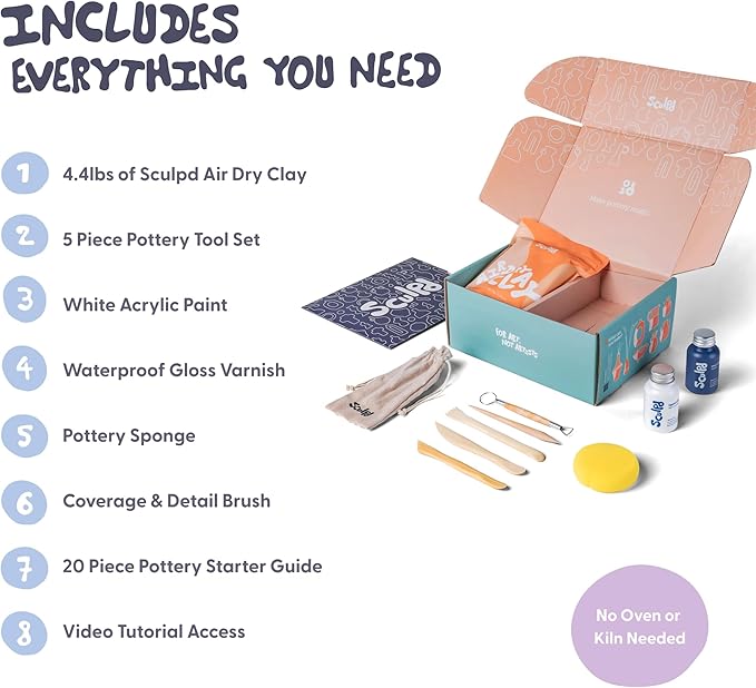 - WHAT YOU GET: 4.4lbs premium air-dry clay, 5 piece sculpting tool set, white acrylic paint kit with 2 fine brushes, waterproof gloss varnish, potter's sponge, step-by-step guide & video tutorials.