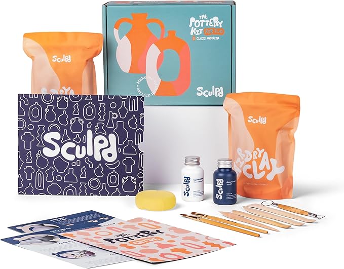 Sculpd Pottery Starter Kit - Complete Air Dry Clay Beginner Set for 2 Adults: Includes Sculpting Tools, Gloss Varnish, Paint Brushes, Guide, Video Tutorials & More - Date Night Gift, Arts Crafts Hobby