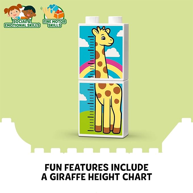 - Large Building Blocks - The LEGO DUPLO set features a child's teddy bear, giraffe height chart, sink, sofa, opening suitcase, and 2 chairs for creative construction